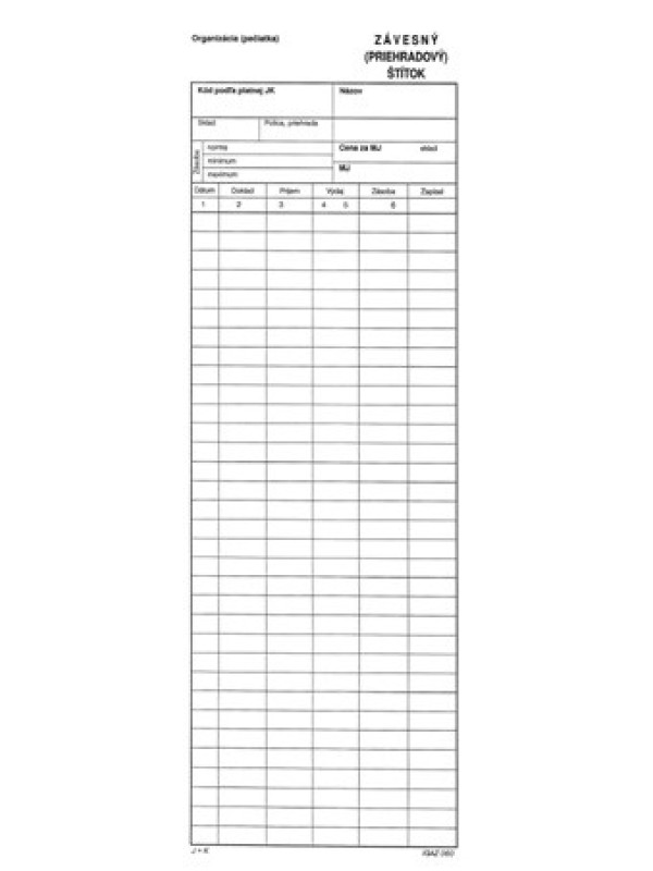 Tlačivo - Skladová karta na evidenciu skladových zásob. Je to závesný priehradkový štítok na regále. Rozmer 30 x 10 cm.