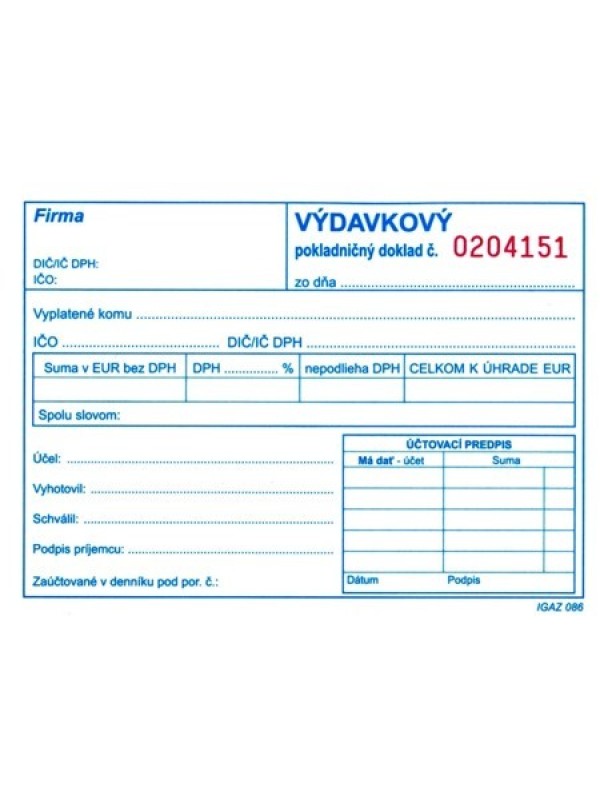 Tlačivo výdavkový pokladničný doklad je na samoprepisovacom papieri. Doklady sú vopred očíslované.