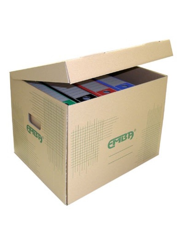 Archívna škatuľa Emba UB3 je úložný box na uloženie a transport archívnych boxov a poradačov. TYP UB3 je vyrobený z hnedej vlnitej lepenky so zelenou potlačou a je určený na uloženie 5ks poradačov 8cm, alebo “Archive boxov” I/75 mm z hladkej lepenky. Má výklopné veko. Rozmery: 425 x 330 x 295 mm. Archívna krabica.