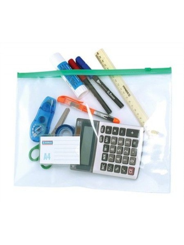 Zatvárateľný závesný obal z PVC na zips, predná strana je priehľadná.