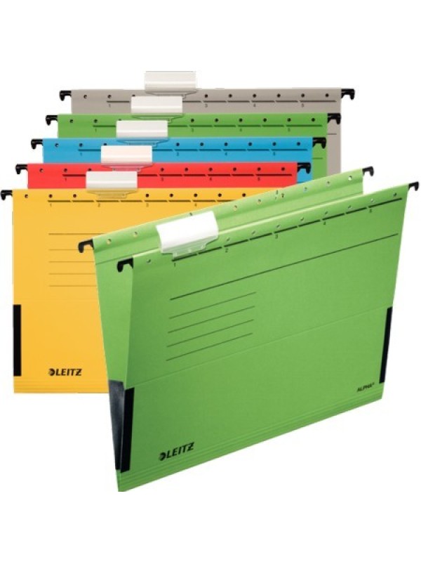 Závesný zakladač Leitz Alpha 1986 je zakladacia doska s lepenými bočnicami. Vhodné na zakladanie voľných listov do formátu A4. Bočnice zabraňujú vypadnutiu dokumentov z dosiek. Vyrobené z hrubého kartónu colorspan 225 g/m2. Bočnice sú vyrobené z patentovaného, veľmi pevného materiálu. Súčasťou každých dosiek je veľký plastový rozlišovač s vymeniteľným štítkom na popis obsahu na 2 - 3 riadky. Rozlišovač je možné umiestniť na vodorovnej aj zvislej strane dosiek. Vnútri dosiek sú výrezy na upevnenie rýchloviazacích svoriek (nie sú súčasťou - kód v tomto obchode: 0503021). Rozmer: 348 x 260 mm. Balenie obsahuje 25ks z jednej farby. Predaj na kusy. Farby: žltá, červená, modrá, zelená, sivá.