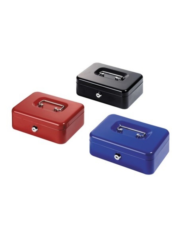 Kovová pokladnička s rozmermi 205 x 150 x 70mm.