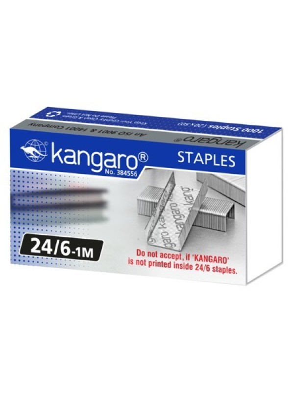 Náboje Kangaro 24/6 - zošívacie spinky vyrobené z najkvalitnejšieho oceľového drôtu. Vždy garantujú vynikajúce výsledky pri zošívaní. Krabička obsahuje 1000 ks spiniek. Vhodné napríklad pre zošívačky Kangaro Trendy 35, Kangaro LE45, Kangaro LE35...