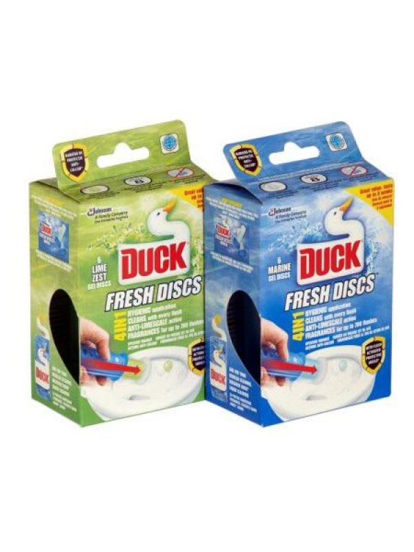 Duck Fresh discs - čistič WC. Čistí a osviežuje, jednoduché a hygienické použitie. Zásobník obsahuje 6 gélových diskov, vydrží až 6 x 100 spláchnutí. Stačí použiť aplikátor na vytláčanie gélu na disk vo vnútri vašej WC misy.