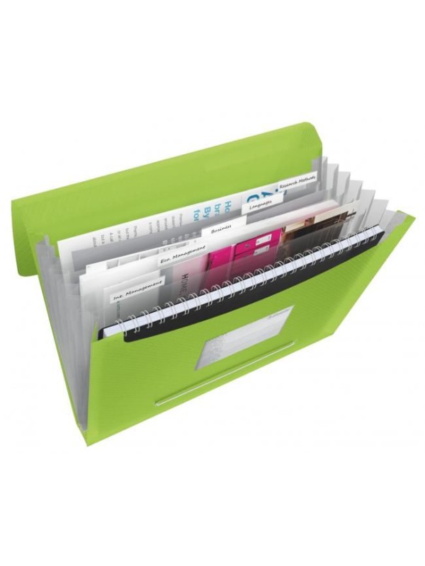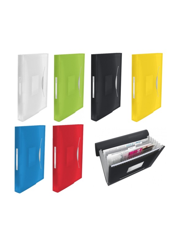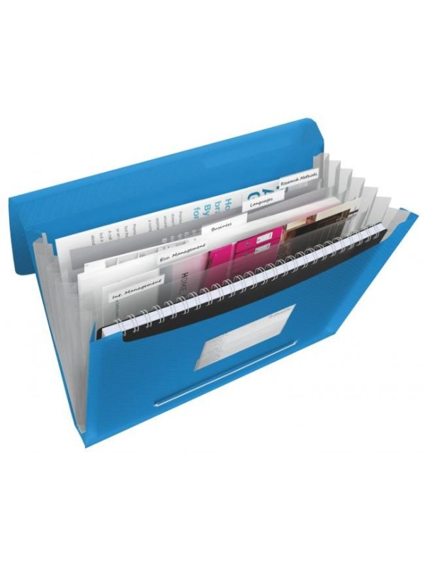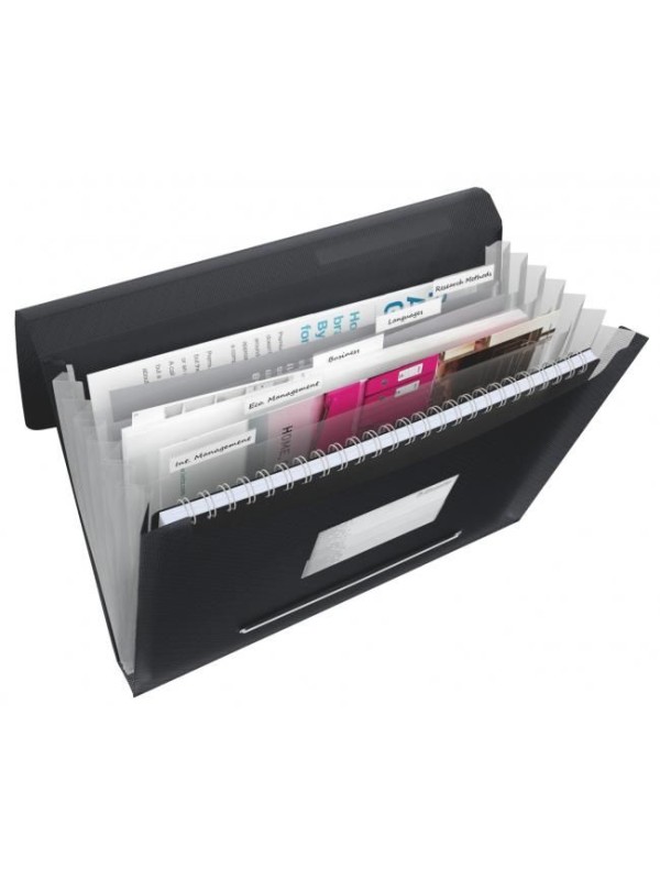 Aktovka na spisy vyrobená z priehľadného polypropylénu hrúbky 670 mic. Vhodné k triedeniu dokumentov do 6 rôznych priehradiek. Vrátane vrecka na vizitky a samolepiaceho chrbtového štítku.