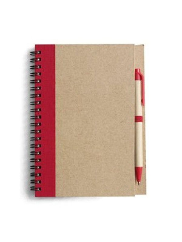 Blok A5 štvorčekový s bočnou špirálou, ktorého súčasťou je guľôčkové pero z biologicky rozložiteľných materiálov. Na obale červená páska. Vyrobené z recyklovaného papiera. 60 listový blok. Rozmery: 13,7 x 18 x 0,7 cm.