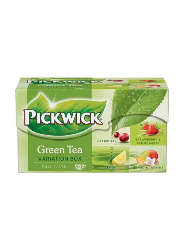 Zelený čaj PICKWICK variácie - citrón, jazmín a mango, brusnice, jahody a citrónová tráva. Porciovaný v nálevových vreckách.