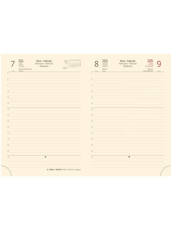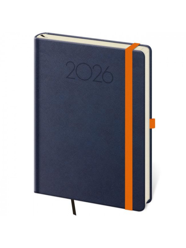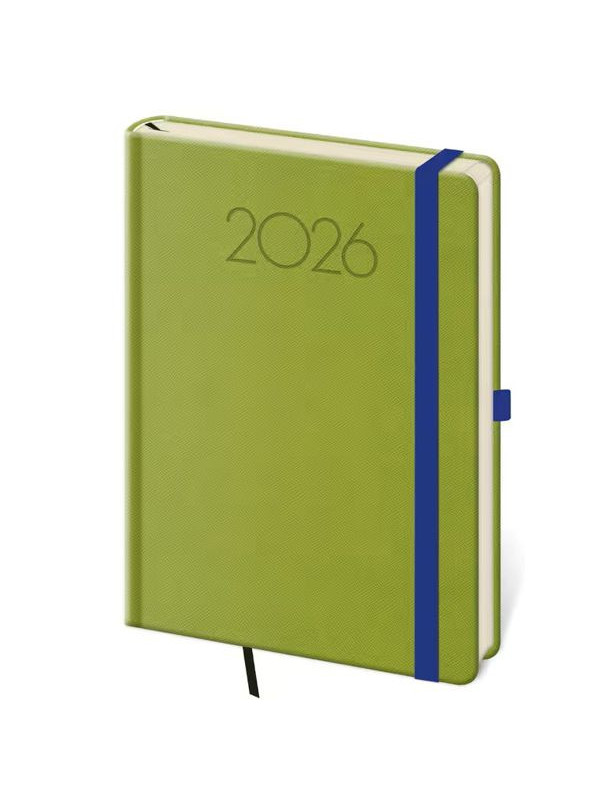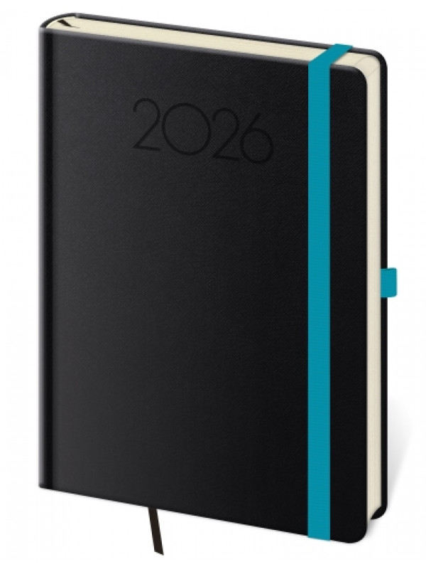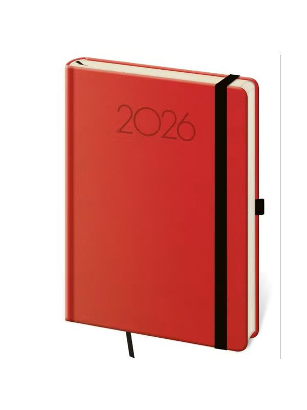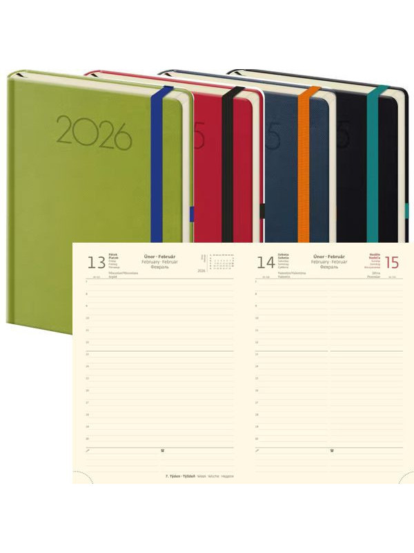 Denné diáre New Praga na rok 2026 so zatváraním gumičkou. Sú vyrobené zo zaujímavej matnej koženky s nepravidelnou štruktúrou, doplnené gumičkou kontrastnej farby. Odporúča sa razba bez fólie. Rozmer: 143 x 205 mm, rozsah: 352 strán. Diár obsahuje: osobné údaje, plánovač dovolenky, plánovací kalendár, medzinárodné telefónne predvoľby, tiesňové volania v európskych štátoch, časové pásma, vzdialenosti miest v ČR a SR, prevodník jednotiek, prevodník konfekčných veľkostí, medzinárodné sviatky, ročný výhľad, denný layout, adresár, mapu Európy, ČR a SR. Farby: čierna, modrá, červená, zelená. Diáre 2026.