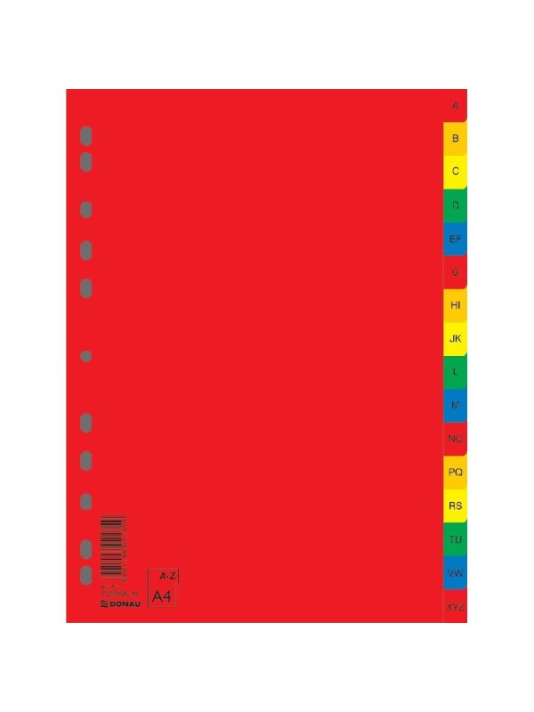 Abecedný rozraďovač A - Z vhodný na triedenie dokumentov. Vyrobený z tuhého polypropylénu. Jednotlivé listy rôznych farieb, možnosť použitia v pákovom aj krúžkovom zakladači.
