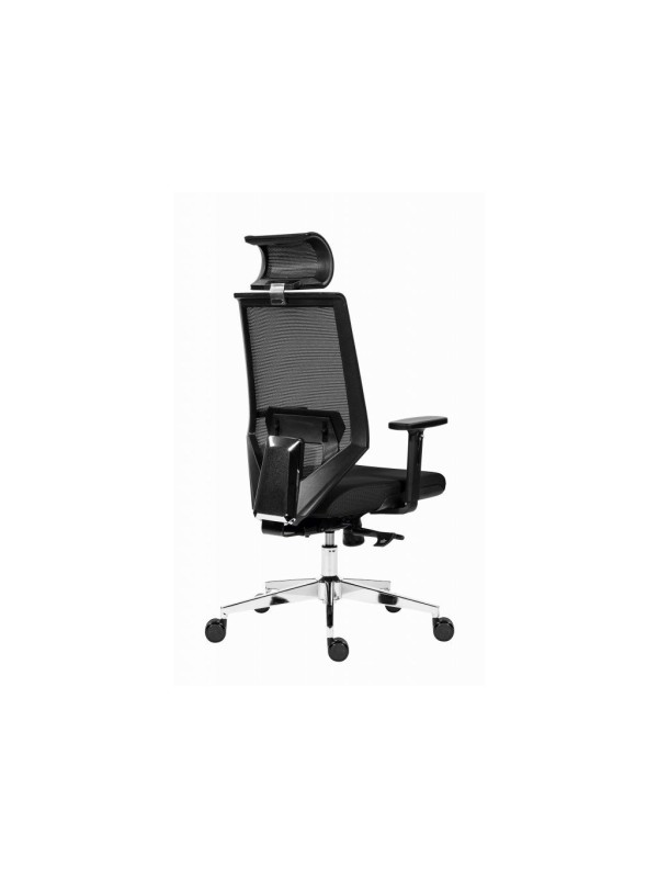 Kancelárska stolička s opierkou hlavy z čiernej sieťoviny a výškovo nastaviteľnou bedrovou výstuhou. Nastavenie výšky operadla so systémom up-down, synchrónny mechanizmus s niekoľkonásobnou aretáciou a nastavením sily protiváhy, chrómový oceľový kríž.