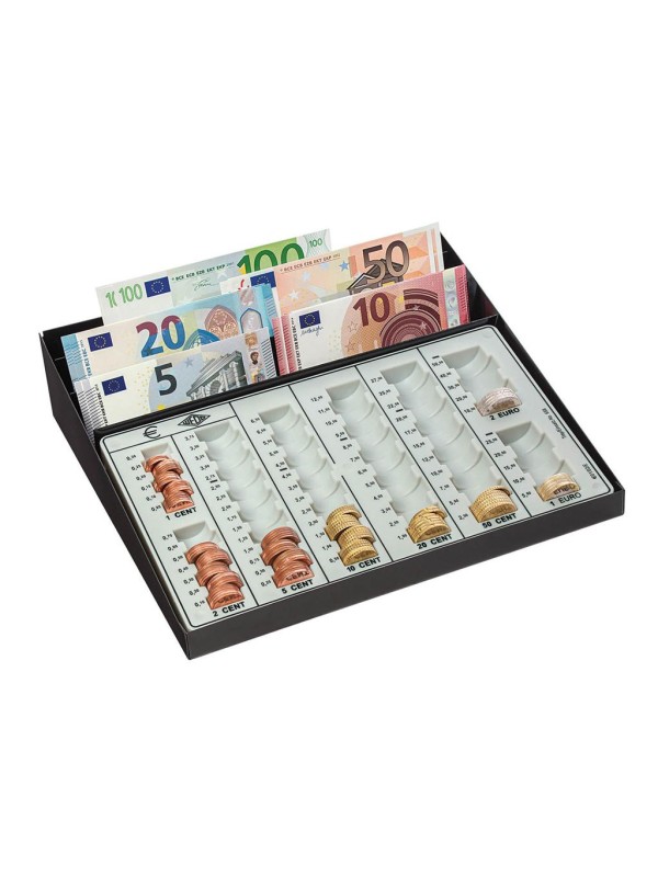 Samostatná mincová priehradka v oceľovom ráme. Rozmerovo vhodná do bežnej stolovej zásuvky. Priestor s tromi priehradkami na bankovky, poukážky alebo stravné lístky vo vrchnej časti. Maximálna kapacita 125,75 Euro.