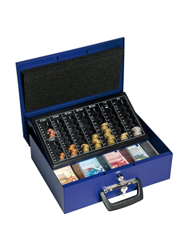 Pokladnička s 8 oddielmi na eurá a centy a 4 priehradkami na bankovky. Na vnútornej strane veka je pena, ktorá bráni pohybu a premiešaniu mincí pri prenose, dve madlá na prenos pokladničky. Vrátane dvoch kľúčov.