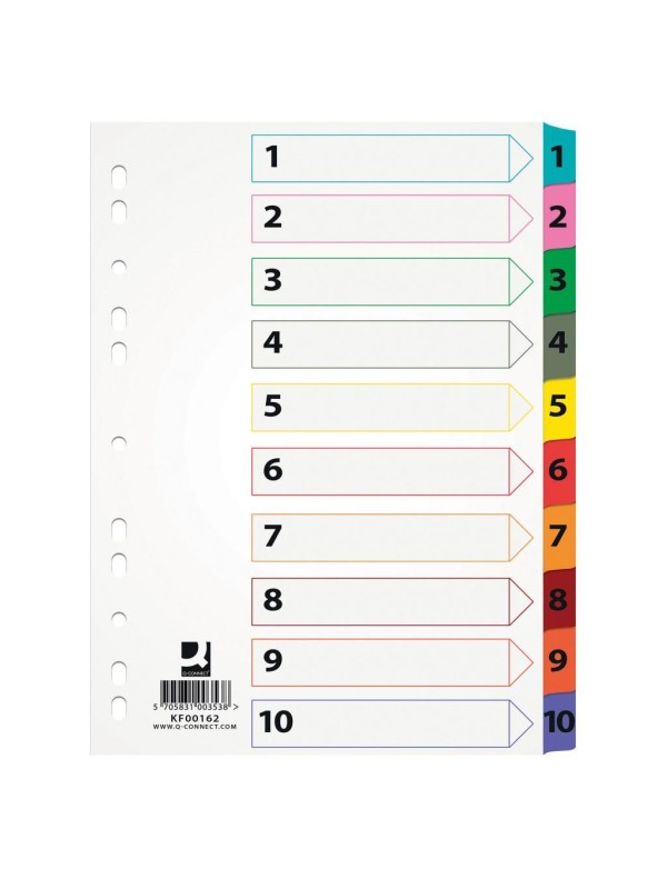 Číselný rozraďovač č. 1 - 10 vyrobený zo zosilneného kartónu s laminovanými indexami. Plastové rozlišovacie okraje, vrátane popisovateľného titulného listu. Balenie jedna sada v polyesterovom sáčku.
