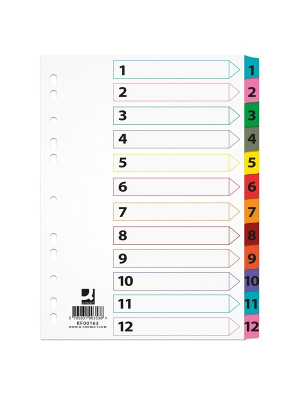 Číselný rozraďovač č. 1 - 12 vyrobený zo zosilneného kartónu s laminovanými indexami. Plastové rozlišovacie okraje, vrátane popisovateľného titulného listu. Balenie jedna sada v polyesterovom sáčku.