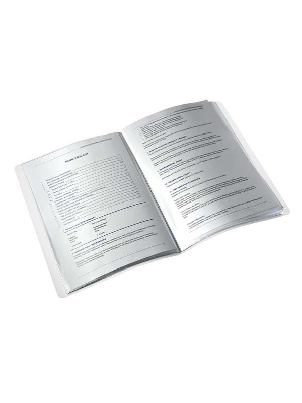 Katalógová kniha na prezentáciu dokumentov formátu A4. Vyrobená z polypropylénu. Vybavená 20 čírymi vreckami hrúbky 45 μm a samolepiacou chrbtovou etiketou na popis.
