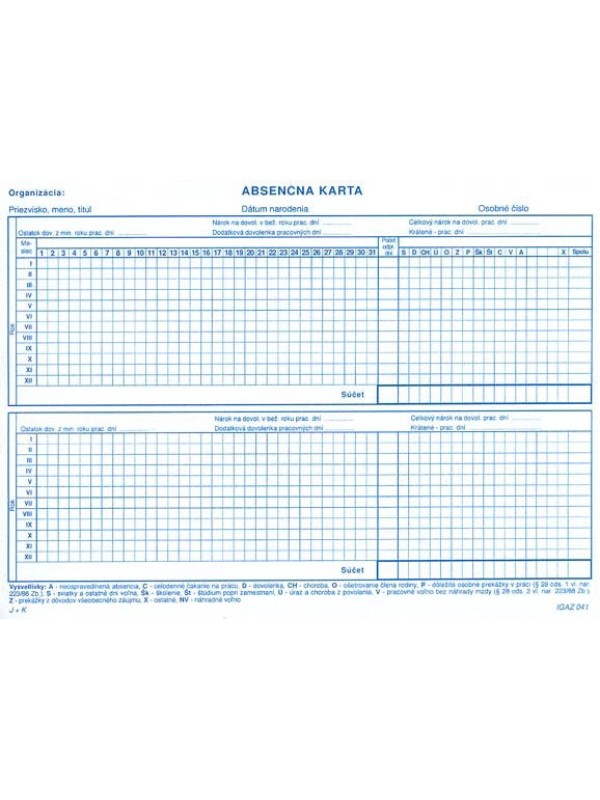 Absenčná karta, formát A5.