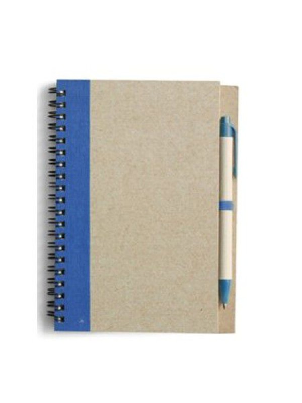 Blok A5 linajkový s bočnou špirálou, ktorého súčasťou je guľôčkové pero z biologicky rozložiteľných materiálov. Na obale modrá páska. Vyrobené z recyklovaného papiera. 60 listový blok. Rozmery: 13,7 x 18 x 0,7 cm.