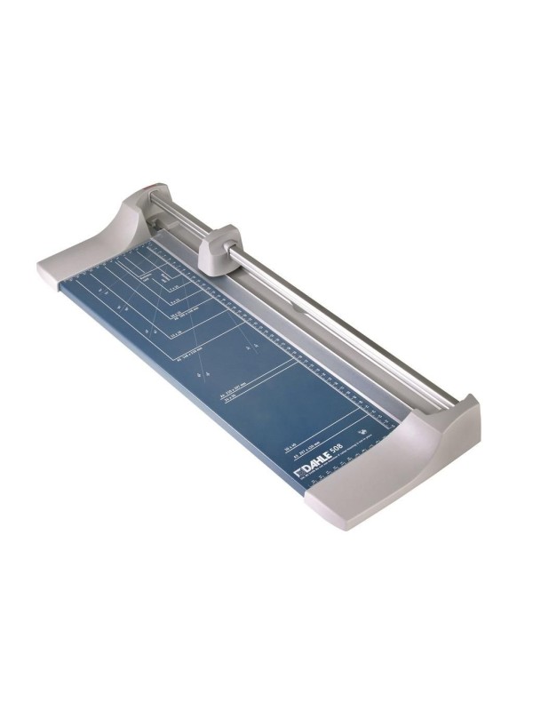 Rezačka s kruhovým nožom a kovovou základňou. Rotačný nôž v plastovom kryte, automatický prítlak, mierky v cm a DIN formátoch.