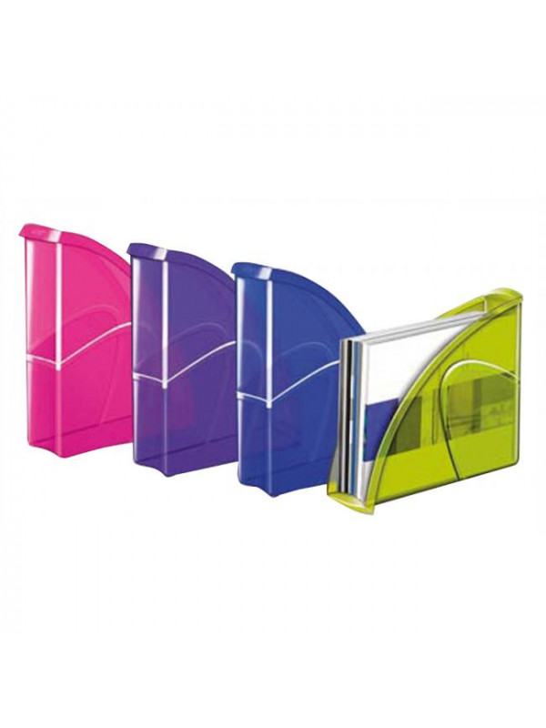 Stojan na časopisy s možnosťou vertikálneho alebo horizontálneho postavenia má elegantné línie, zvýraznené materiálom s kontrastným matným povrchom na hladkom pozadí. Vhodný na dokumenty do veľkosti 24 × 32 cm. Kapacita 700 listov (80 g / m²), rozmery 270 × 85 × 310 mm. Materiál 100% recyklovateľný vysokokvalitný plast. Väčšie balenie 10 ks. Farba transparentná ružová, fialová, modrá, zelená
