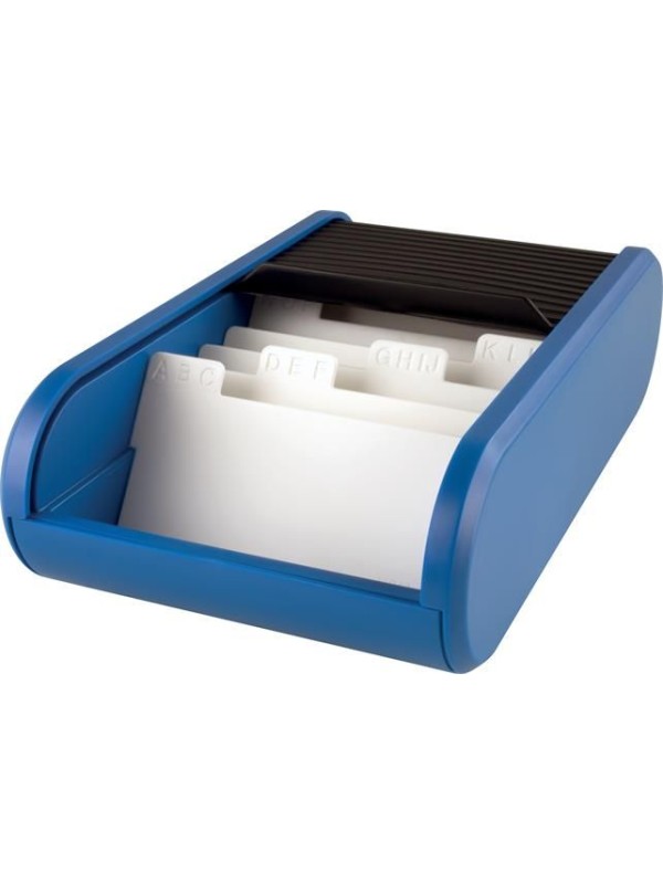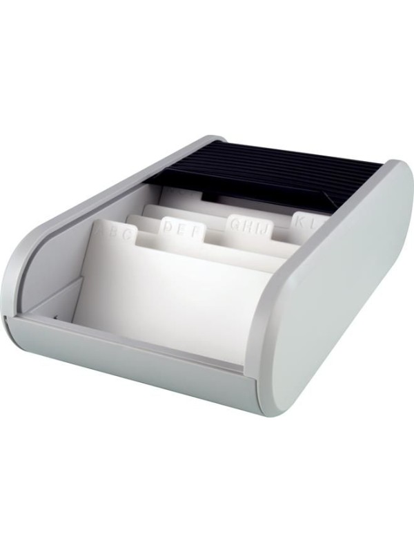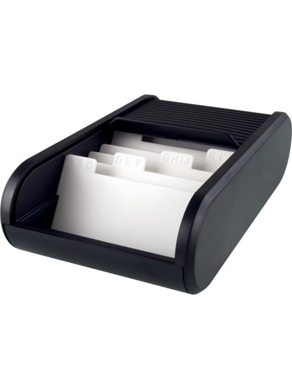 Vizitkár na jednoduché a praktické zakladanie vizitiek. Roletový kryt chráni vizitky pred prachom.