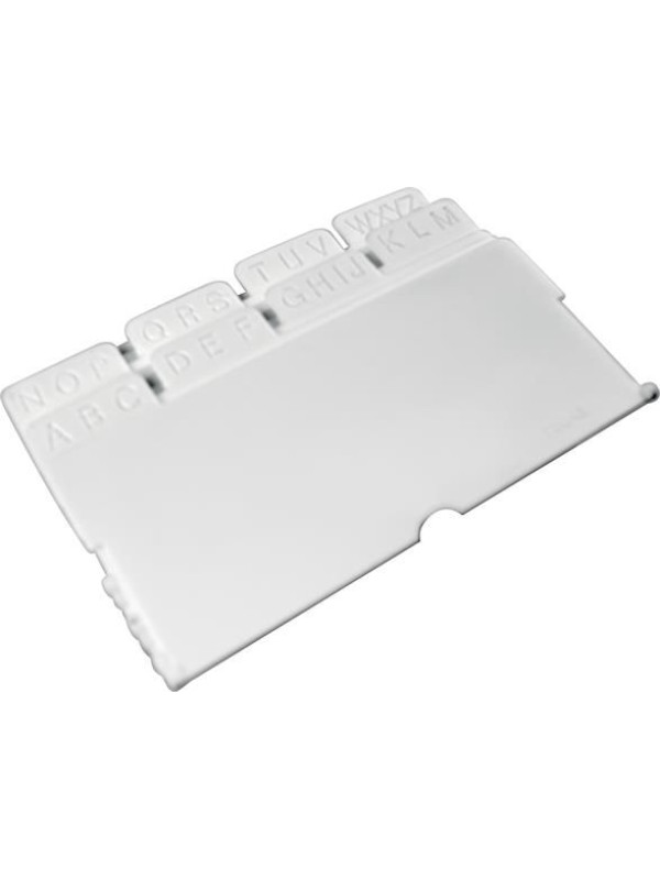 Vizitkár má A-Z register. Kapacita 300 vizitiek s rozmermi 67 x 102 mm.