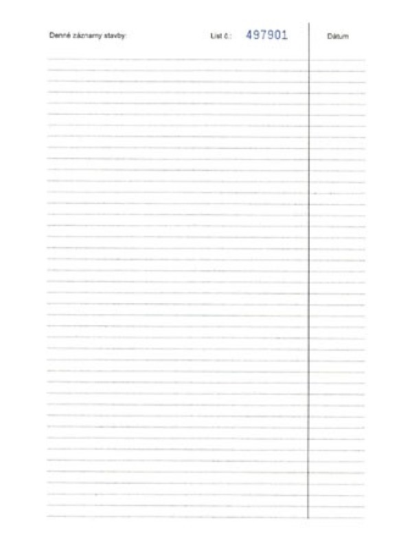 Stavebný denník. Formát: A4. Rozsah: 150 strán. Strany sú číslované, jedno číslo na troch listoch (kópie 1+2).