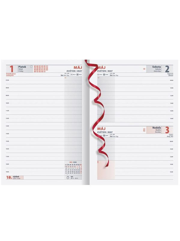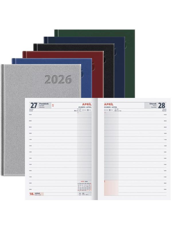 Denný diár na rok 2026 s hodinovým delením dňa, slovenské a české kalendárium, prehľad dôležitých inštitúcií, informácie o štátnych sviatkoch susediacich krajín EU, priestor na písanie poznámok, pripomienok, adresár. Šitá väzba, pevný koženkový obal vo farbách: čierna, svetlomodrá, tmavomodrá, zelená, bordová a strieborná. Formát: 140 x 204 mm, rozsah 336 strán. Diáre 2026.