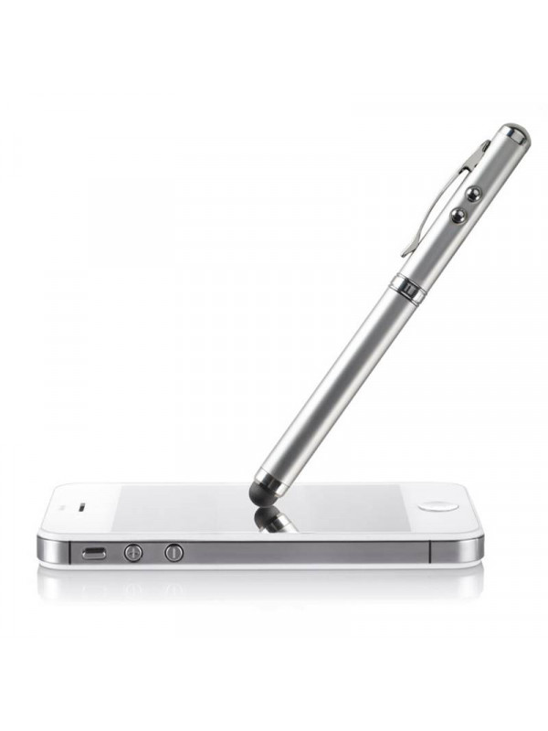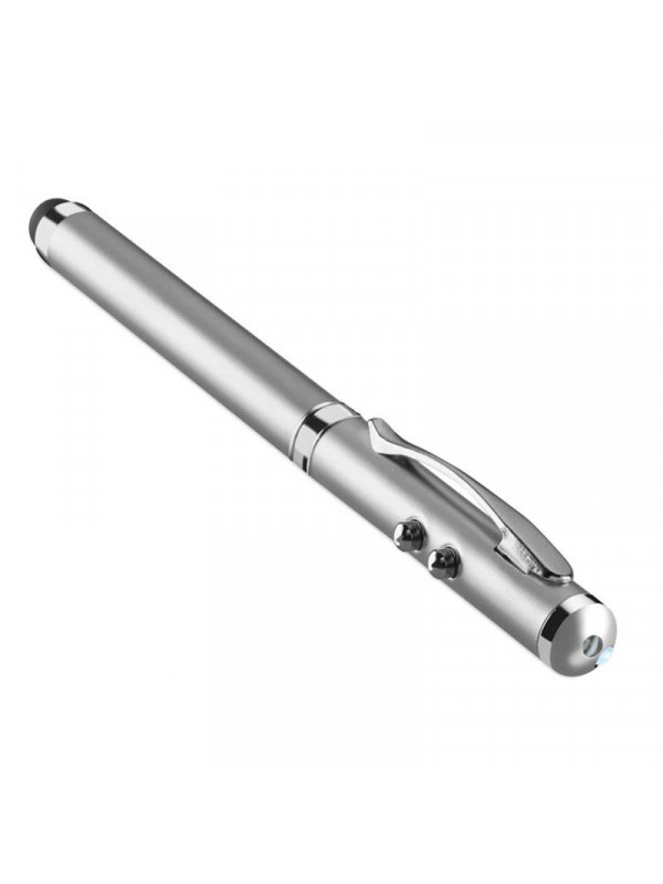 Multifunkčné strieborné kovové guľôčkové pero. Modrá náplň, biele LED svetlo, červené laserové ukazovátko a hrot pre dotykové obrazovky. Obsahuje 3 batérie. Dodáva sa v kovovej krabičke. Rozmery: 18x4x2 cm.