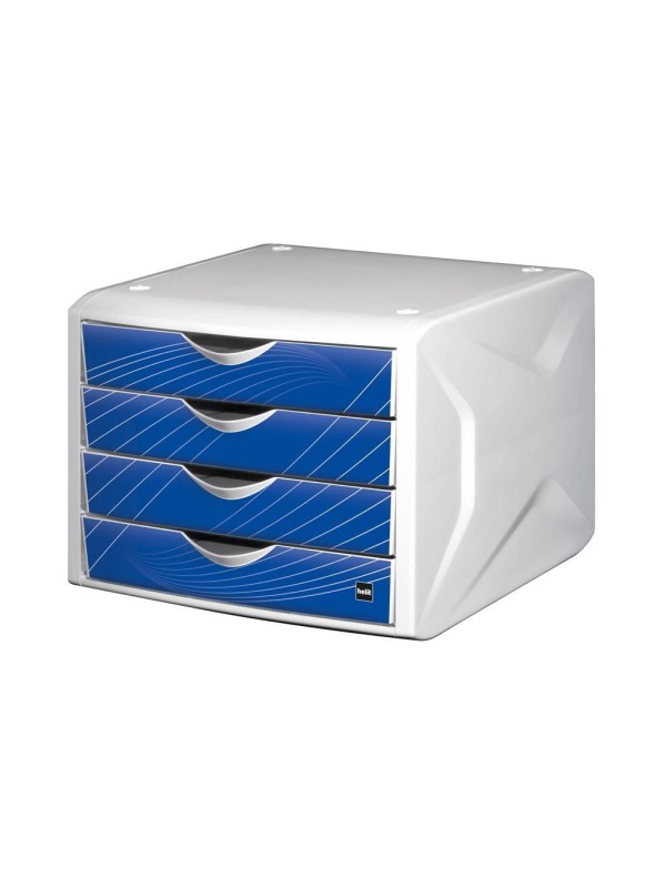 Stohovateľný box z odolného polypropylénu so štyrmi zatvorenými zásuvkami a dekoráciou na prednej strane v sviežom dizajne.
